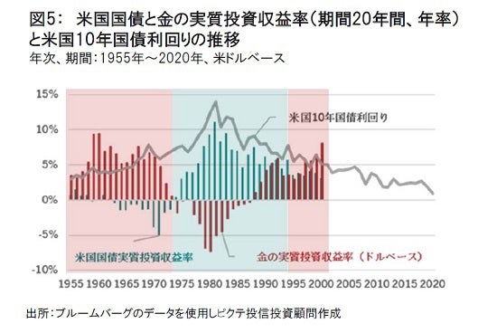 過去には、米国国債と金の超長期の実質投資収益率(期間20年)を米国国債の利回りとの関係から分析すると利回り7%近辺が投資判断のひとつの分岐点となったことが分かる(図5参照)。つまり7%以上の高い金利環境においては国債のほうが実質投資収益率が高く、それ以下の環境においては金の方が高くなったということだ。