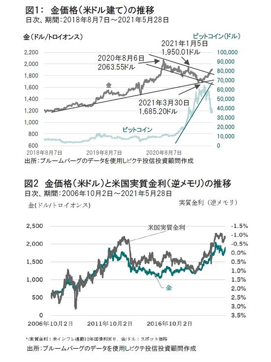 インフレ懸念の台頭は過去においてマーケットローテーションを引き起こし、市場では実体価値の無い資産から実体価値を有する資産へと物色対象を変化させた。今年2月以降、成長期待の高さで昨年大きく上昇したハイパーグロース系の株式のうち、利益に裏付けされた実体価値のない企業の株式は大幅に下落している。今年4月まで急騰してきた仮想通貨もここにきて急落しているが、これも中国による規制の強化などでその実体価値に疑問が生じているからである。一方、こうした動きと同時に金(実体価値を有する通貨)は上昇転換している(図1参照)。足元においてマーケットローテーションが始まっているからだと理解している。