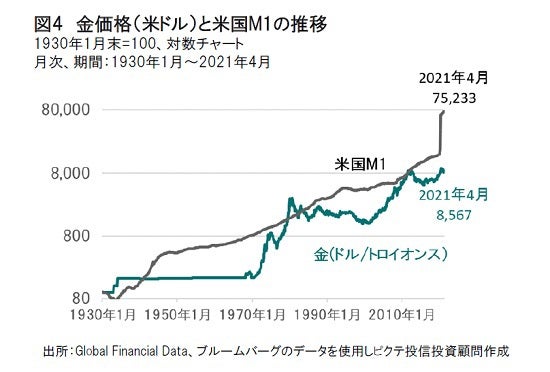 米国が金本位制を離脱し自由に通貨供給を行えるようになったニクソンショック(1971年8月15日)を起点に米ドルの通貨供給量(M1)の伸びを算出するとリーマンショック( 2008年9月15日)までは年率約5.2%であったがコロナショック後の2021年4月末現在では同9.3%の伸びと急上昇している。仮に金の期待される年間の供給量が2%とするとその差異7.3%が金の上昇要因となる。あるいは米ドルの通貨価値を維持するには米国国債の利回りが7.3%必要になることを意味すると考えることもできる。