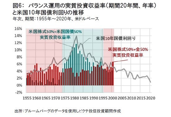また株式を併せ持った場合(バランス運用)においても同様である。1955年以降、米国株式50%と金50%のバランス運用は低金利時代に強く、米国株式50%と米国国債50%のバランス運用は高金利時代に強いというシミュレーション結果となった。