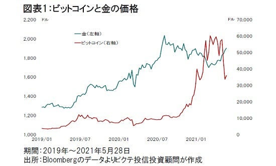 3月8日の1オンス=1,683ドルを底として金の価格が上昇している。一方、暗号資産の代表格であるビットコインは、4月15日の6万3,410ドルを天井に調整局面だ。過去2年間、金とビットコインは逆相関的な動きをしてきた(図表1)。いずれも通貨価値下落のヘッジ手段として選好されたが、短期的にはイベントによりマネーの移動が起こっているのではないか。