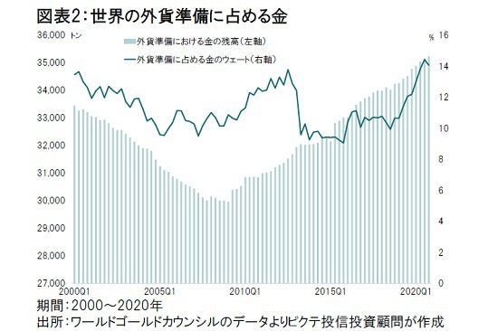 一方、紀元前から通貨として活用されてきた金は、1971年8月のニクソンショックで米国が金とドルの兌換を停止した後も、外貨準備の中核的な手段として多くの国により公的に保有されてきた。リーマンショック後、各国が外貨準備として持つ金は増加傾向にある(図表2)。