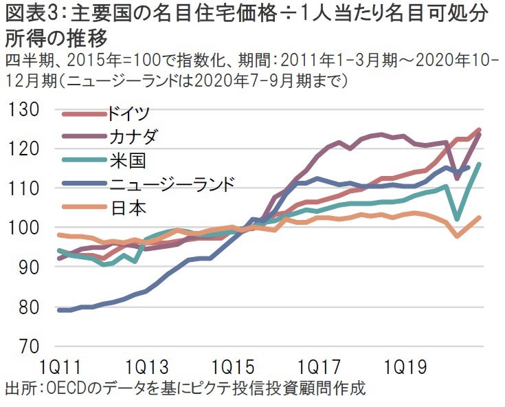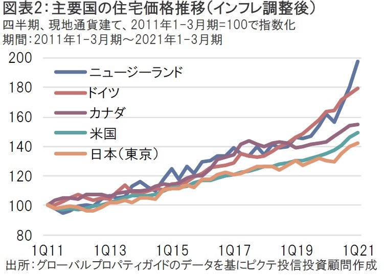 これはアフターコロナにおける一過性の現象とは言い切れない。主要国の住宅価格は年々上昇しており、NZは過去10年間でインフレ調整後の住宅価格が約2倍になったほか、ドイツも同期間で約8割上昇しているからだ(図表2)。