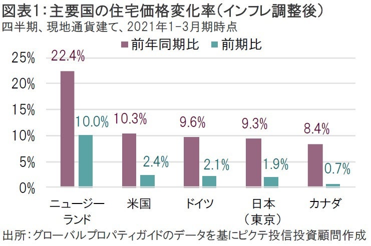 2021年1-3月期の主要国の住宅価格は大きく上昇した。前年同期との比較ではコロナショックによるベース効果があるとは言え、ニュージーランド(NZ)は前年同期比+22.4%、米国は同+10.3%、ドイツは同+9.6%、そして日本でも同+9.3%と大幅な伸び率となった。また、前期との比較でも、NZは前期比+10.0%、米国は同+2.4%、ドイツは同+2.1%、日本も同+1.9%となった(図表1)。