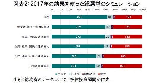 もう1つの重要な決定要因は、野党の選挙協力ではないか。2017年10月の総選挙を活用してシミュレーションすると、立憲民主党が共産党と全小選挙区で候補者調整した場合、自民党が単独過半数割れする可能性が台頭する(図表2)。