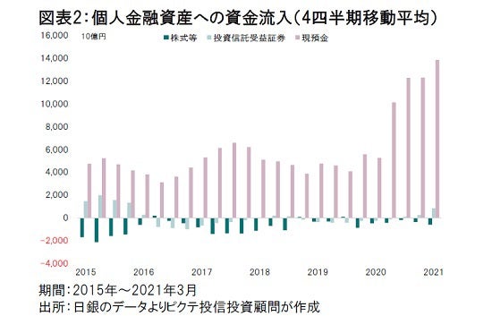 ちなみに、新型コロナ禍に見舞われた2020年度、フローベースで見ると、個人金融資産には54兆9,606円が流入した。このうち、投資信託にネットベースで3兆3,069億円が投資された一方、現預金への資金流入額は55兆3,654億円に達している(図表2)。また、株式の保有総額は47兆2,228億円増加したものの、それは株価の上昇による評価益の拡大であり、フローベースでは2兆4,262億円の資金流出だ。こうした数字を見る限り、印象と違って家計による現預金からリスク性資産へのシフトは進んでいない。