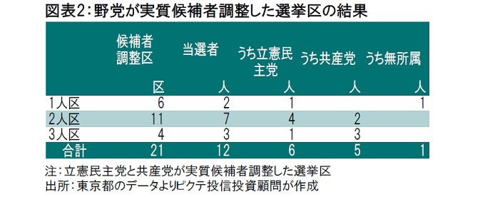 今回の都議選で注目されたのは、自公両党での過半数奪回と共に、国政野党である立憲民主党と共産党の実質的な選挙協力の成果だった。結果は全42区中、無所属を含めて21区で候補者調整が行われ、12区で議席を獲得、立民は改選前の8議席を15議席に伸ばしている(図表2)。