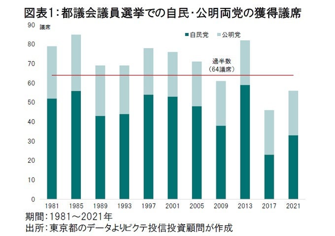 もっとも、今回の都議選の影響が無視できないのは、第1に自民党と公明党が選挙協力したにも関わらず、自民党の議席が過去2番目に少なかったことだ。前回の選挙において、公明党は小池百合子都知事率いる都民ファーストの会と連携した。国政で連立を組む両党の全面協力の結果、都議会で過半数に届かなかった意味は小さくない(図表1)。