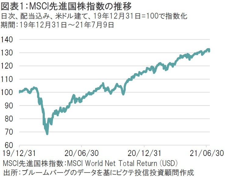 MSCI先進国株指数のチャートから明らかなとおり、先進国株式市場は昨年3月のコロナショック後は堅調な展開となっている(図表1)。この要因として一般的に挙げられるのが、主要各国地域における①大規模な財政支出、②積極的な金融緩和、そして③新型コロナワクチンの接種拡大だ。