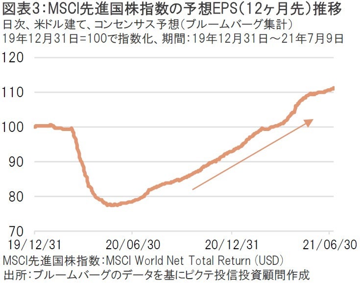 一方、予想EPSは昨年3月にボトム(底)をつけた後、右肩上がりで上昇基調となっている(図表3)。予想PERの急上昇からも見て取れるように、コロナショック直後の先進国株式市場は期待先行型で上昇していた(予想EPSは低迷)。