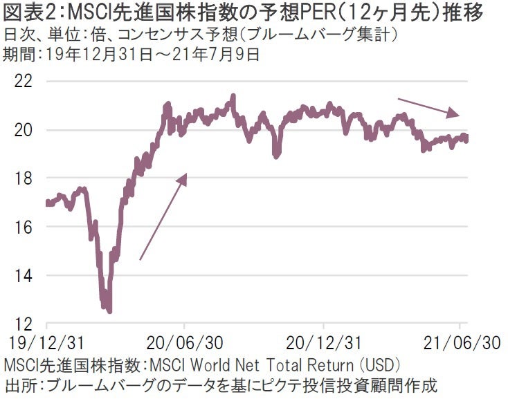 しかし、②の積極的な金融緩和が「現在進行形」で行われているにもかかわらず、予想PERは年初来で低下傾向にある(図表2)。昨年3月のコロナショックの際には予想PERが12倍台まで低下し、その後は昨年6月にかけて21倍台まで急上昇するなど、2020年は予想PERの拡大が株式市場の上昇を主にけん引する「金融相場」となった。だが、今年に入ってからの株式市場では、むしろ予想PERが幾分低下する逆転現象が起こっている。