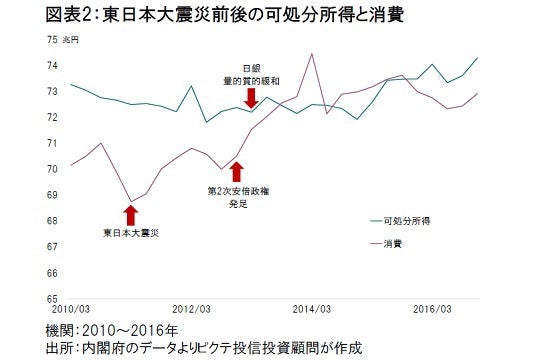 震災以前の水準へ向け消費が本格的に回復したのは2013年に入ってからであり、2013〜15年に関しては、可処分所得を上回る消費が行われた(図表2)。つまり、この間、フローベースでの貯蓄率はマイナスになっている。