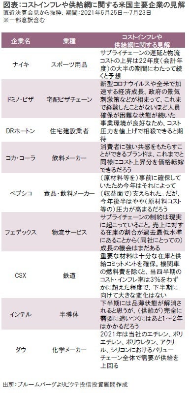 また、足元で需要過多となっている業界やブランド力のある企業は容易にコスト増加分を製品/サービス価格に転嫁することが可能だ。例えば住宅建設業者のDRホートンは、事業環境が良好なためコスト圧力を値上げで相殺できるとコメントしているほか、コカ・コーラもブランド力があればコスト上昇分を価格転嫁できると自信を示している。