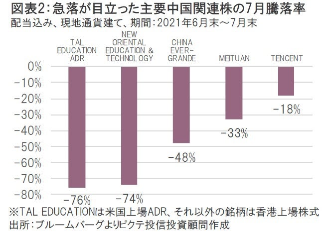 その代表的な業界のひとつが教育だ。中国では学習塾の費用が高騰しており、教育格差が問題視されている。このため、小中学生向けの学習塾運営事業者を非営利団体へ移行させるほか、株式市場を通じた資金調達を制限するなど、教育費の増加を是正する構えだ。これを受けて、TAL EducationやNew Oriental Education & Technologyといった中国教育関連株は軒並み暴落した(図表2)。