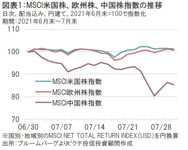 中国当局による規制強化の流れは今後も続くことが想定されるため、関連業界については注意が必要だ。しかし、これまでのところ中国株の急落は局所的なリスク・イベントにとどまっており、欧米株式市場全体への波及効果は限定的だ。欧米株式市場の市場参加者は、比較的冷静に事態の推移を見守っている状況と言えよう。