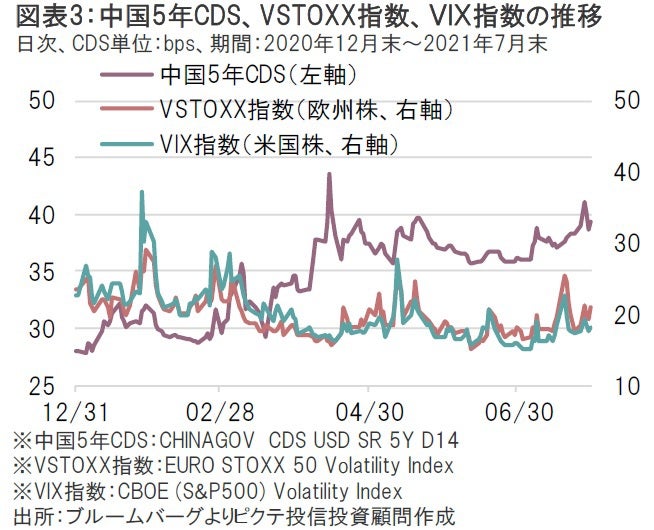 中国5年CDS(クレジット・デフォルト・スワップ、発行体の信用リスクを対象とするデリバティブ契約)はやや上昇したものの、大幅な信用リスクの悪化を示す状況にはない。また、マーケットの不安が高まる局面で上昇する傾向にある米国株や欧州株のインプライド・ボラティリティ指数(VIX指数とVSTOXX指数)も比較的安定している(図表3)。