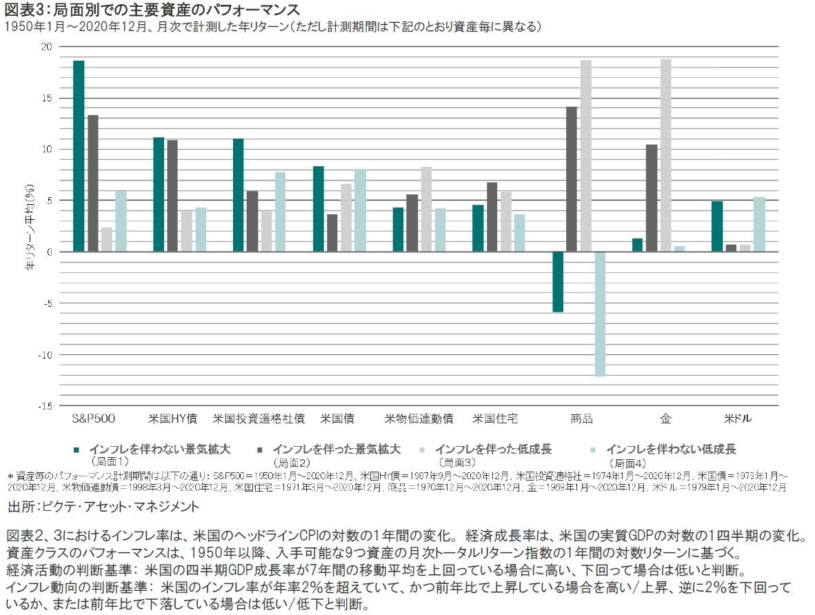 このように経済活動の状況に変化が見える中、インフレリスクが高まってきていることもあり、経済拡大とインフレを変数として、景気が拡大している時期と減速している時期、インフレ率が高い時期と低い時期とで、市場環境を4つの局面に分け、過去代表的なアセットクラスがそれぞれの局面でどのようなリターンとなったのかを分析した(図表2、図表3参照)。