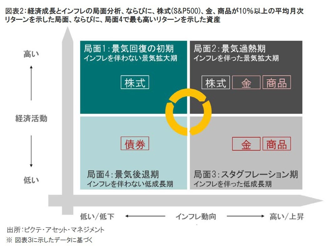 各局面での各資産の月次で計測した年リターンの平均値を比較しているが、リターン計測の開始時期は資産毎に異なるので必ずしも公平な比較とはいえない。したがってあくまでも参考として見ていただきたいが、局面1の景気拡大の初期(インフレを伴わない景気拡大期)は、株式(S&P500)、米国ハイ・イールド(HY)債、米国投資適格社債などのリスク資産のリターンが優れ、局面2の景気過熱期(インフレを伴った景気拡大期)には、商品、株式、米国HY債と金、そして、局面3のスタグフレーション期(インフレを伴った低成長期)には、金と商品が、そして局面4の景気後退期(インフレを伴わない低成長期)には、米国債や米国投資適格社債が相対的に優れたパフォーマンスを示した事がみてとれる。つまり、インフレ昂進期(局面2と局面3)を通じて金と商品が優れたパフォーマンスだった。