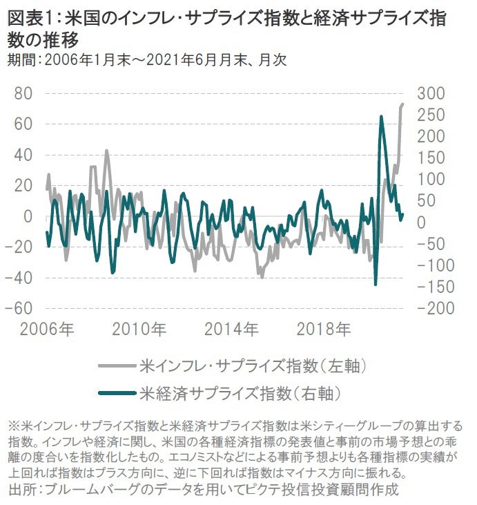 金融市場ではインフレリスクは一時的な要因によるものとの見方が浸透し、その織り込みが進んでいるようだ。しかし、大方のエコノミストの予想を上回るインフレ指標が発表されてきているだけでなく、その予想からの上振れ度合いも高まっていることが、米インフレ・サプライズ指数の急速な上昇には表れている。一方で、これまではエコノミスト予想を大きく上回っていた経済指標は、足元はその予想を上回る度合いが大幅に減少しており、経済サプライズ指数は低下傾向にある(図表1参照)。この2つの方向性はリスク資産には好ましくない。