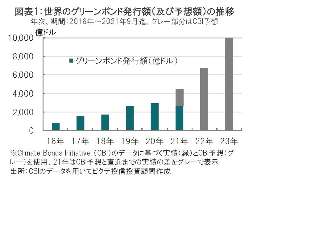 今回はグリーンボンドに焦点を当て、その規模を発行額で見ると着実に市場の拡大の様子が伺える(図表1参照)。