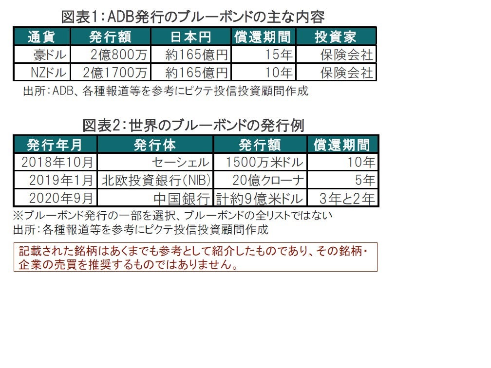 アジア開発銀行(ADB)は2021年9月10日、アジア・太平洋地域の海洋関連プロジェクトへの融資を目的とした、オーストラリア(豪)ドルおよびニュージーランド(NZ)ドル建てのデュアル・トランシェ・ブルーボンドを発行しました(図表1参照)。ADBとして初のブルーボンド発行となりました。
