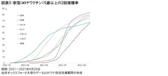 また、新型コロナ感染第5波が収束しつつあることも、政権与党にとっては追い風だろう。ワクチン接種は急速に進み、15歳以上の2回接種率は米国に並んだ。総選挙の時期には、接種率は80%程度に達すると見られる(図表3)。