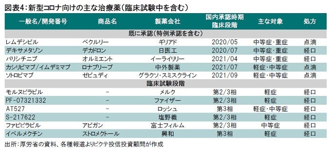 「岸田首相」の下、自民党が総選挙で250議席程度を確保すれば、当面、政治は安定するだろう。さらに、新型コロナ向け軽症、中等症対象の経口治療薬が相次いで承認される見込みだ(図表4)。2022年に関しては、”with Corona”ではあるが、本格的な経済活動の再開が期待される。