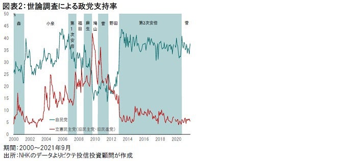 ちなみに、第2次政権発足以降、報道各社の世論調査において、自民党は高い支持率を維持してきた(図表2)。背景は、3年3ヶ月に続いた旧民主党政権と比べた安定感と見られる。今年に入って菅内閣の支持率は急低下したが、自民党の支持率は概ね安定していた。