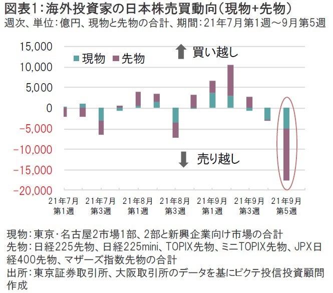 菅前首相による突然の退陣表明で一気に高まった日本株の「政局相場」は、岸田新内閣の政策に対する警戒感から短命に終わろうとしている。日本取引所グループの集計によれば、今年9月第5週(9月27日~10月1日)の海外投資家による日本株の現物株と先物合計の売買は1兆7568億円の売り越しとなっており、これは菅前首相の退陣表明直後の9月第2週(9月6日~9月10日)における1兆587億円の買い越しを帳消しにしただけでなく、昨年2月第4週(2月25日~2月28日)の1兆7768億円の売り越し(コロナショック)に匹敵する記録的な金額だった(図表1)。海外勢が失望した理由は、自民党総裁選で「改革派」と見られていた河野太郎氏が敗れ、「所得再分配」を重視する岸田文雄氏が勝利したためだ。特に市場関係者の間では、岸田文雄新首相が提言した株式の売却益や配当への金融所得課税の強化に対する警戒感が広がっている。
