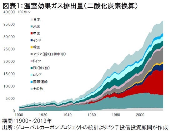 もっとも、2019年までの20年間に限れば、世界の温室効果ガス排出量増加分の57.6%を中国が占め、日本、中国、韓国、インドを除くアジアが25.1%、インドの比率も13.9%に達していた(図表1)。一方、日本、米国、EUの排出量は減少している。つまり、新興国・途上国による排出量の伸びを抑え、減少傾向にしない限り、温暖化を止めることは難しいだろう。