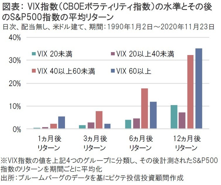 実際、今回のようにVIX指数が20以上40未満となった過去の局面では、その後のS&P500指数の平均リターンがプラスになる(「VIX20未満」より「VIX20以上40未満」のほうが1ヶ月後、3ヵ月後、6ヵ月後の平均リターンが高い)傾向が見られた。「既知の未知」リスクの発生によってVIX指数が急騰(S&P500指数は急落)し、その後は「既知の未知」リスクが「既知の既知」リスクになる過程で市場が落ち着きを取り戻し、S&P500指数が回復するパターンを繰り返していたと推察される。