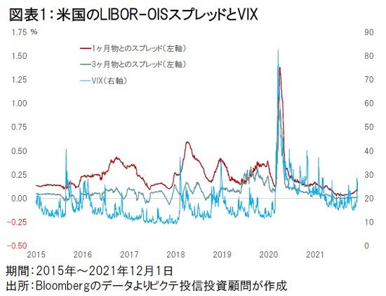 南アフリカでオミクロン型が発見され、株式や原油市場ではショックが広がった。もっとも、米国の金融市場全般を見渡すと、例えばクレジットマーケットでは、LIBOR-OISスプレッドが低水準での推移を続けている(図表1)。また、株式市場は調整局面を迎えているが、VIXが史上最高値を記録した昨年3月と比べ、パニックに陥っているわけではない。