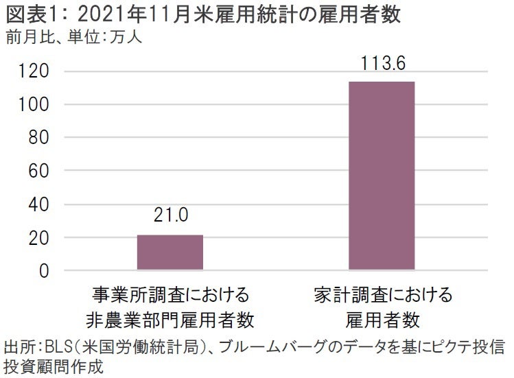 12月3日に発表された11月米雇用統計は、事業所調査である非農業部門雇用者数が前月比21.0万人増と市場予想の同55.0万人増を大きく下回ったが、家計調査である失業率は4.2%と市場予想の4.5%を下回り、前月の4.6%から大きく低下した(図表1)。事業所調査と家計調査との間でここまで大きな乖離が見られることは不可解だが、家計調査では労働参加率が前月の61.6%から61.8%へ上昇する中で雇用者数が前月から113.6万人も増加したこともあり、マーケットでは家計調査による雇用統計の上振れが材料視され、テーパリングの加速観測がさらに高まる展開となった。実際、セントルイス連銀のブラード総裁も今回の雇用統計を受けて、「おそらく非農業部門雇用者数に(上方)修正が入るだろう」との見解を示している。