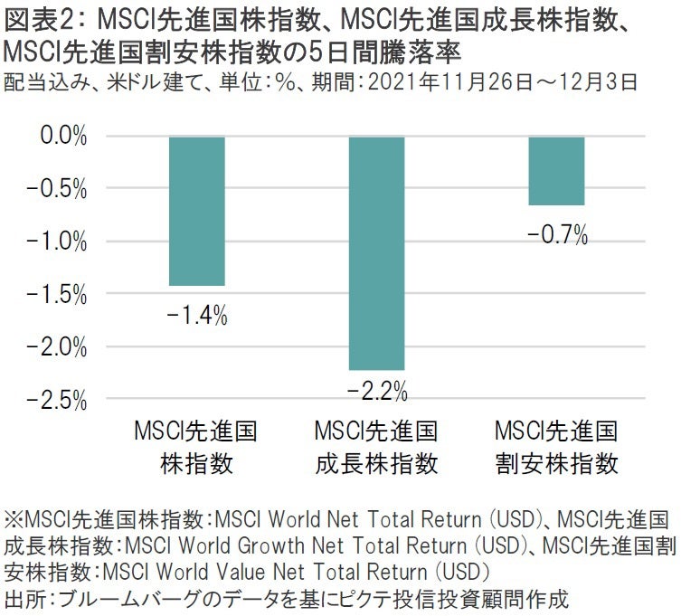 先進国株式市場では一連のテーパリング加速観測によって、直近5日間におけるMSCI先進国成長株指数の下落率がMSCI先進国割安株指数の下落率を上回る展開となった(図表2)。成長株は特にFRBによる積極的な量的緩和政策による恩恵を受けてきただけに、テーパリングによる反動で成長株に対して警戒感が広がったとしても不思議では無いだろう。