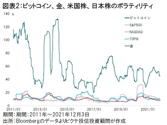 ビットコインの値動きは荒く、米国株や日本株、金など他の資産と比べた場合、ボラティリティは極めて高い(図表2)。これは、投機対象としては非常に魅力的だろう。大きな値幅が狙えるからだ。しかしながら、当初の目的であった送金・決済手段としては使い勝手が悪い。その結果、暗号資産の売買及び保有動機は専ら投機になったのではないか。