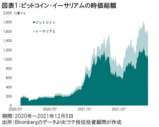 同論文発表前の2008年8月18日、インターネットのドメイン”bitcoin.org”が登録され、2009年1月3日からビットコインの運用が始まった。もっとも、ビットコインは瞬く間に投機の対象になり、価格が急騰したのである。その結果、足下の時価総額は1兆ドル前後に達した(図表1)。ビットコイン以外の暗号通貨を総計すると、12月9日現在の時価総額は2兆3千億ドルとなり、東証1部の約3分の1まで拡大した模様だ。