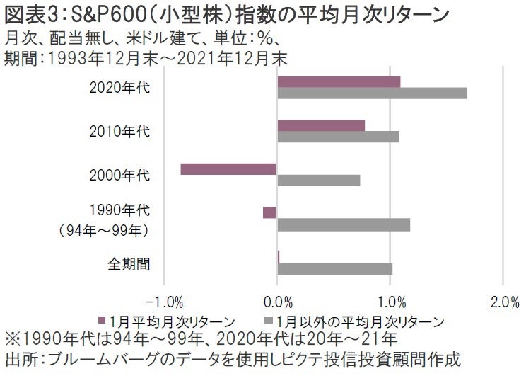 また、S&P500指数よりも時価総額が小さいS&P400(中型株)指数では「1月効果」は2010年代のみ見られ、さらに時価総額が小さいS&P600(小型株)指数では「1月効果」は全く見られなかった(図表2、3) (注:データの関係上、 S&P400指数における1990年代は91年~99年、S&P600指数における1990年代は94年~99年のみ)。「1月効果」はほぼ消失した可能性があるので、安易に「アノマリー」に期待するのは禁物だ。