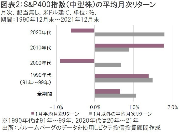 しかし、「1月効果」が見られたのは1990年代までであり、2000年代には大きなマイナスのリターンを計上している。2010年代には再び1月の平均月次リターンが高くなっているがその差はわずかであり、2020年代(20年~21年)は今のところマイナスのリターンだ。
