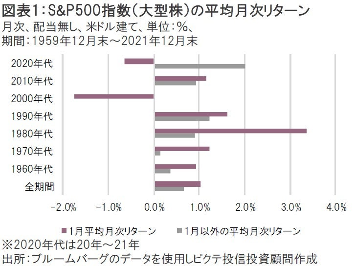 1月のリターンが1月以外のリターンよりも高いかどうかを検証するため、米国株の平均月次リターンを計算してみたのが図表1~3だ。S&P500指数における月次リターンを1960年代から計測してみると、たしかに全期間でみれば1月の平均月次リターンが1月以外の平均月次リターンよりも高いことが見て取れる(図表1)。
