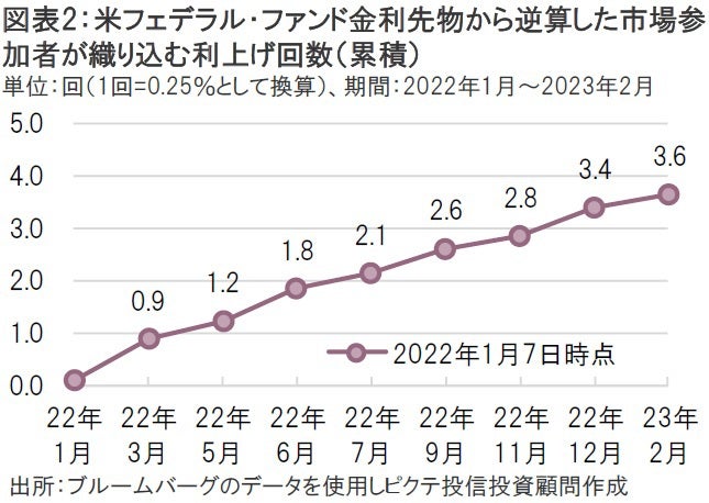また、7日の米国フェデラル・ファンド金利先物市場では、今年のFRBによる利上げを約3.4回(1回は0.25%の利上げ、 6日時点は約3.3回)まで織り込む動きとなり、今年3月の利上げ観測も6日時点の約0.8回から7日は約0.9回へと利上げの織り込みが進んだ(図表2)。