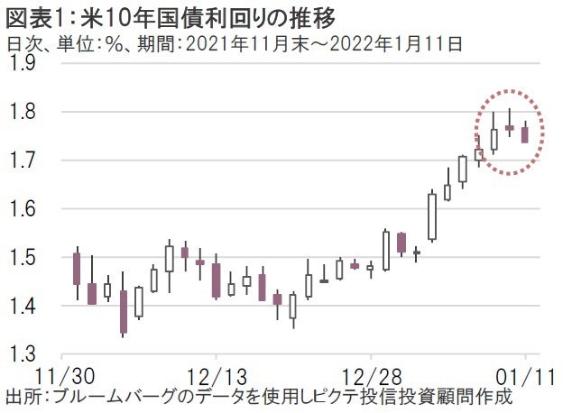 これを受けて、マーケットではFRB(米国連邦準備制度理事会)による金融引締観測がさらに高まる展開となり、7日の米10年国債利回りは一時1.799%(2020年1月以来の水準)まで上昇した(図表1)。