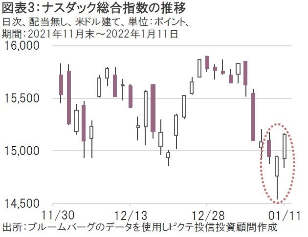 これを受けて米国株式市場でも押し目買いの動きが顕著となった。特に目立ったのがナスダック総合指数における日中の値動きだ。10日のナスダック総合指数はギャップダウン(前日の終値よりも当日の始値が安値で寄り付くこと)で始まり、一時は前日比2.7%安(200日移動平均線割れ)まで売り込まれる場面もあったが、その後は急速に「窓を埋める」(ギャップダウンで生じたチャート上の空間を埋めるように上昇する)かたちで押し目買いが入り、10日終値は前日比0.05%高まで値を戻した。また、11日も同1.41%高と続伸となった(図表3)。