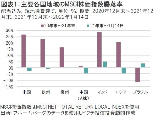 2021年は世界的に大規模な財政支出や主要中央銀行による流動性供給等が行われた結果、主要各国地域における株価指数は先進国株を中心に好調な株価騰落率となった。しかし、年初来では主にFRB(米国連邦準備制度理事会)による利上げ前倒し/保有資産の早期縮小観測を背景に軟調に推移している(図表1)。