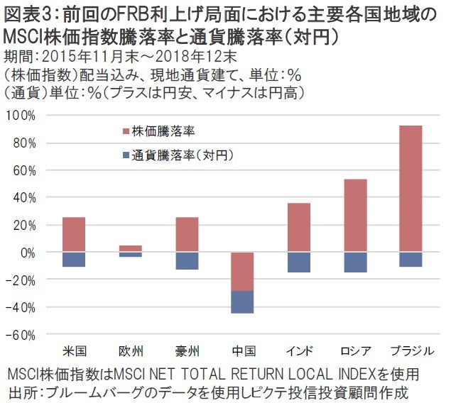 FRBによる利上げ前倒しによる先進国株の株安圧力は、過去の経験則に照らし合わせれば短期的な事象にとどまる可能性がある。前回のFRBの利上げ局面(2015年12月~2018年12月)における株価騰落率は(中国A株以外)株高となっていた(図表3)。先進国株だけでなく、新興国株でも同様の傾向となっていた点は特筆に値する。一方、通貨については円高傾向となっており、今年の年初来の方向感と概ね一致する。