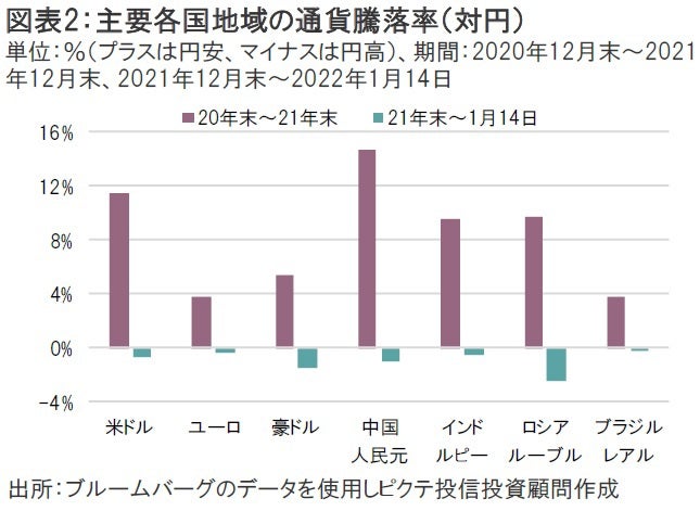 一方、21年における通貨別騰落率では、円の独歩安が顕著となった(図表2)。日本経済の低成長と低インフレに伴う内外金利差の拡大、原油高による貿易収支悪化、さらには先進国株式市場における「リスクオン」などが円安要因として挙げられるが、年初来ではやや円高基調となっている。
