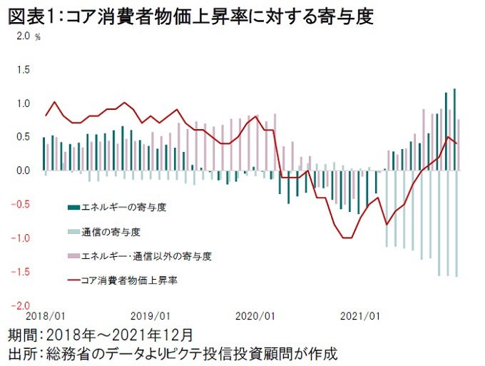 12月の消費者物価統計を詳しく見ると、コア指数に対する寄与度はエネルギーが+1.2ポイント、通信は▲1.6ポイントだ(図表1)。通信は、菅義偉前首相が第2次安倍政権の官房長官時代から引き下げの必要性を強く主張、2021年3月より大手3社はデータ容量20GBの新たな料金プランを導入した。サービスの開始日は、ソフトバンクのLINEMOが3月17日、auのpovoが同23日、ドコモのahamoは同26日である。