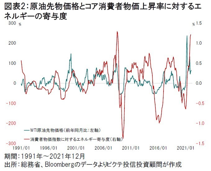 消費者物価統計におけるエネルギーのコア消費者物価への寄与度は、概ね原油市況と連動してきた(図表2)。今後、価格の上昇率は縮小しても、原油、石炭、天然ガス市況のじり高傾向が続けば、燃料コストの上昇により、エネルギーの物価全体への寄与度はプラス圏を維持するだろう。