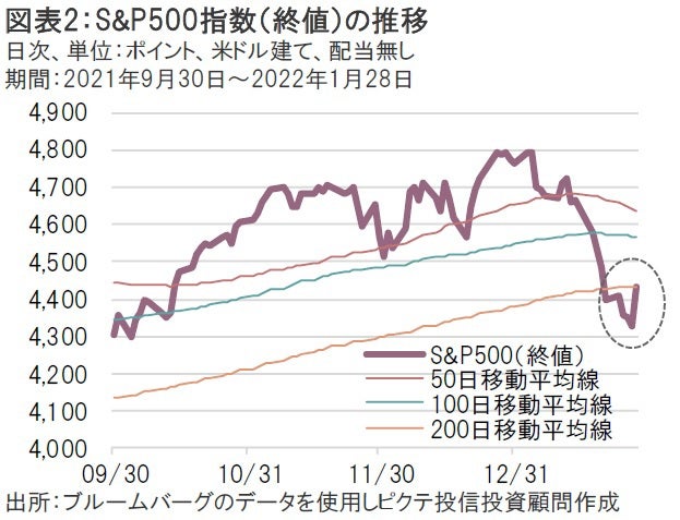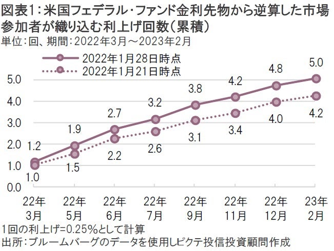 ここまではマーケットの想定通りだった。しかし、肝心の利上げペースや利上げ幅について、パウエルFRB議長はFOMC後の記者会見で終始明言を避けた。このため、マーケットでは3月FOMCで0.25%ではなく0.50%の利上げもありうるとの観測が広がったほか、利上げペースについても年4回からさらに加速するシナリオを一部織り込む展開となった(図表1)。FRBの金融政策方針が明らかになれば株式市場は落ち着きを取り戻すことが期待されていたが、実際はさらに先行き不透明感が高まる真逆の結果になってしまった。
