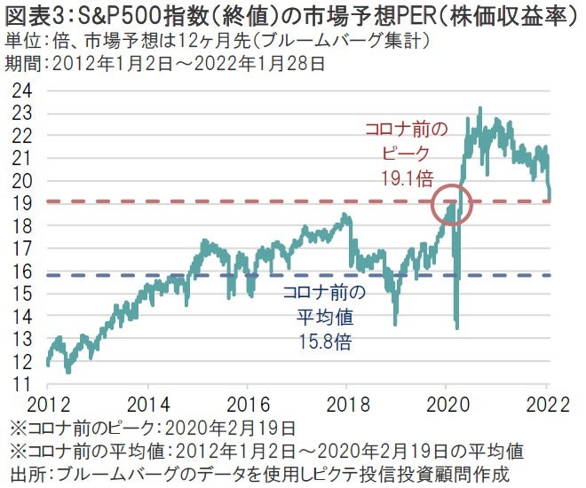 1月26日のS&P500指数は1月FOMC後に前日比プラス圏からマイナス圏に転じ、翌日27日には終値で年初来安値である4,326.51をつけた。しかし、すでに年初来で10%近く下落していたことに加え、27日引け後に米アップルが市場予想を上回る決算を発表したことなどを受け、同指数は28日に前日比2.43%上昇、ちょうど200日移動平均線近辺まで急反発した(図表2)。また、27日は市場予想PER(株価収益率)が19.2倍まで低下し、コロナ前のピーク(2020年2月19日)である19.1倍まで迫ったことも押し目買いを誘発した可能性がある(図表3)。しかし、下値リスクは依然として残されている。FRBの金融政策が不透明な中、今後発表される物価指標が市場予想よりも上昇したり、FRB高官のタカ派発言が相次げば、より一層FRBの金融引き締め観測が高まり、市場予想PERをさらに押し下げる可能性があるからだ(コロナ前の市場予想PERの平均値は15.8倍であり、コロナ前のピークで下げ止まる保証はどこにもない)。米国株が値固めの様相を呈したとしても、当面は予断を許さない状況だろう。