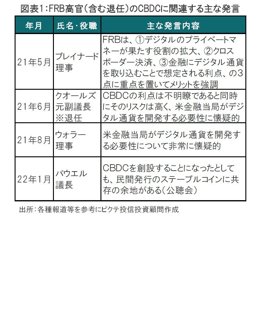報告書全体の印象として、FRBメンバーの賛成、反対をバランスよく反映させたようにも見受けられます。FRB高官の中でも、CBDCに賛否両論が見られます(図表1参照)。